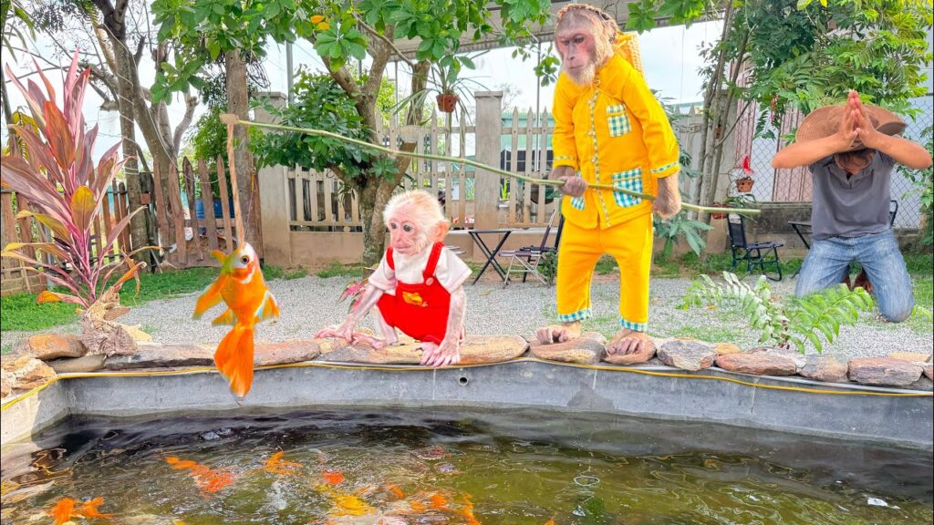 As soon as they started fishing, fish splashed everywhere. The bucket quickly filled, and both monkeys laughed happily. However, at that exact moment, Dad came looking for them. When he spotted CUTIS and the baby monkey fishing at that risky place, his face turned pale. His heart almost jumped out of his chest!