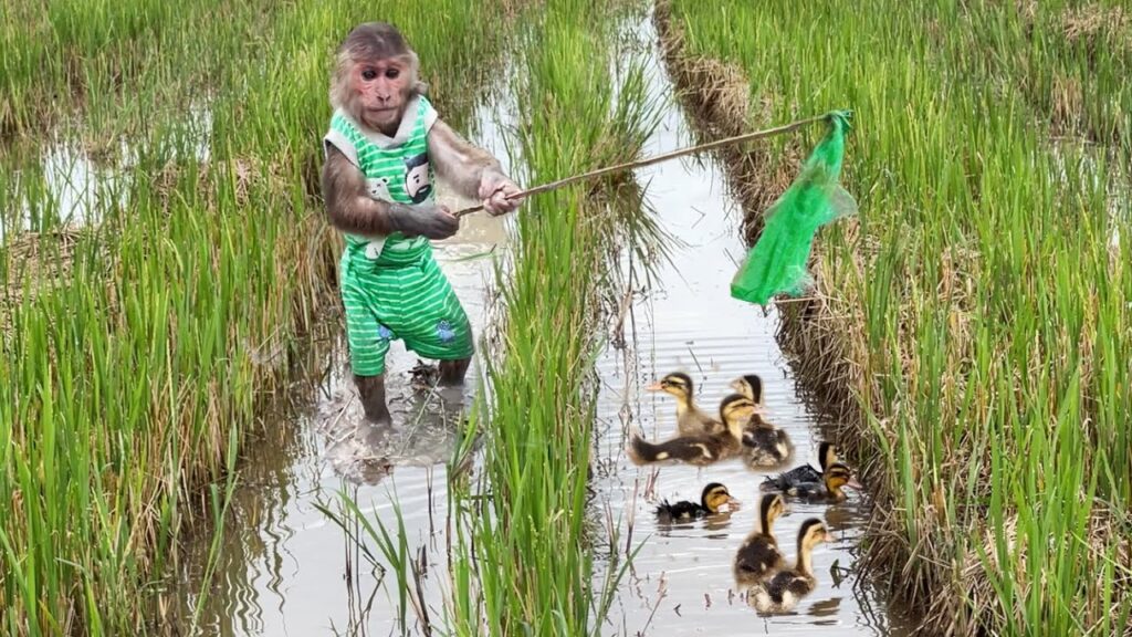 As they reached the rice field, the ducks joyfully splashed into the water. They spread out, swimming, eating insects, and helping clean the field naturally. Cutis watched proudly—he felt like he was doing something very important. His dad patted him on the shoulder and said, “Good job, son. The ducks love your help!”