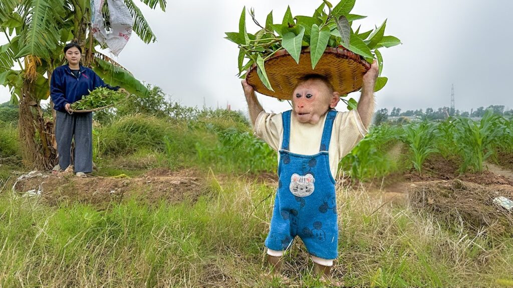 Together, they washed vegetables, sliced sweet potatoes, and mixed rice bran. Lala watched closely, copying Mom’s actions with her tiny hands. Each time something fell, she giggled and picked it up again. Mom praised her effort, guiding her gently and making sure she stayed safe near the hot stove. The smell of warm food filled the air, and Lala’s face lit up with pride.