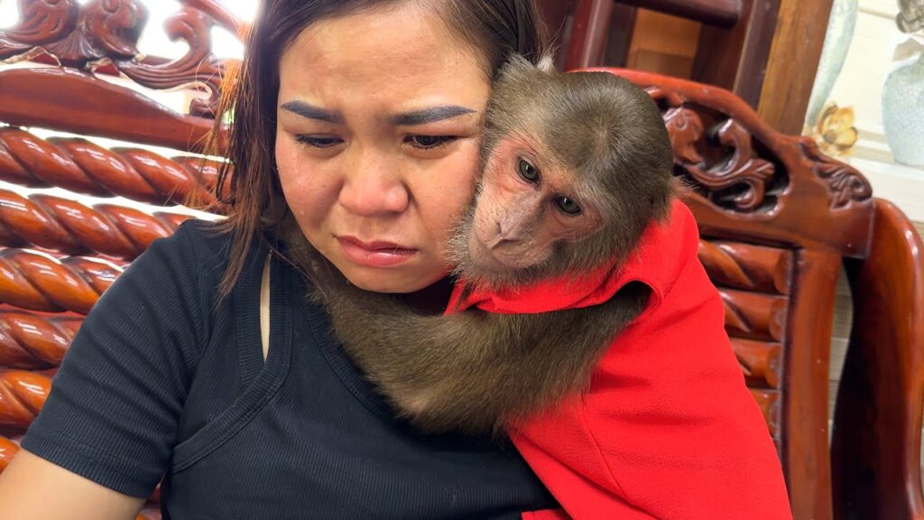 The baby monkey, who had been watching from behind the door, rushed over too. He wrapped his little arms around Mom’s leg, copying CUTIS’s comforting actions. Together, the two tiny helpers hugged her like they were protecting her from the sadness itself.