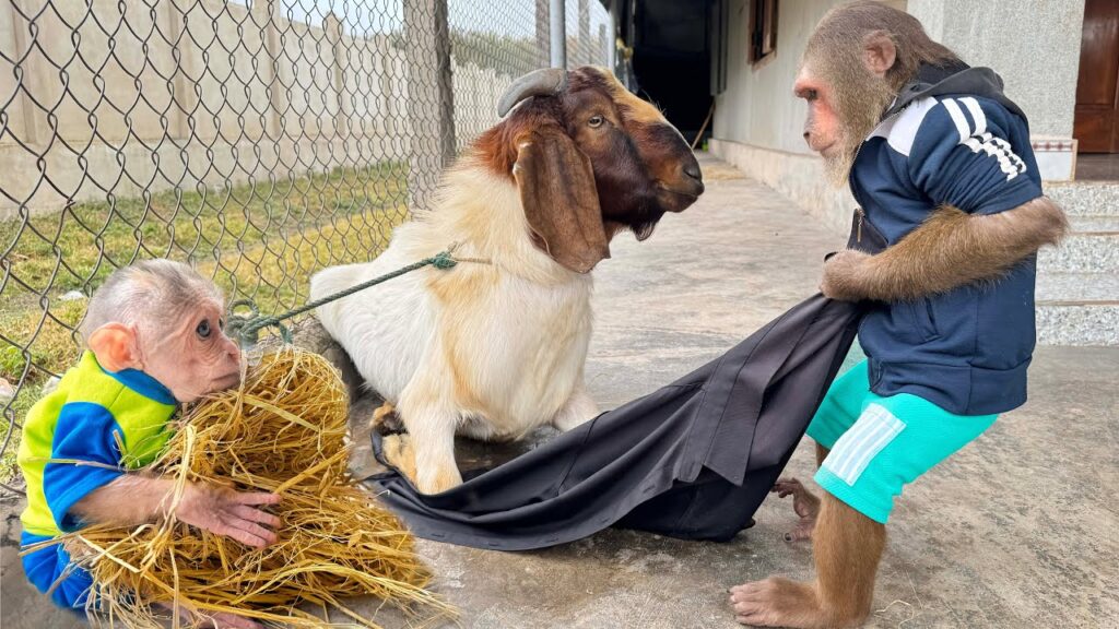 CUTIS quickly waved his hands, signaling Buem to act fast before Mom returned. The two rushed over with the funniest expressions, trying to gently persuade the goat to move without causing chaos. Buem offered a bunch of grass as a distraction, while CUTIS carefully pulled the laundry from under the goat.